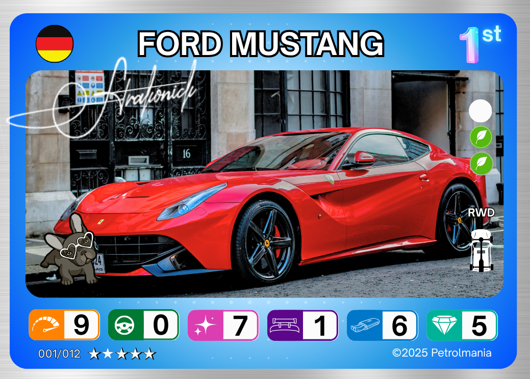 Vítejte ve světě Petrolmanie – zbrusu nové sběratelské karetní hry, která vás vtáhne do adrenalinového světa ikonických muscle aut. Pokud milujete sílu, rychlost a jedinečný design legendárních vozů jako je Ford Mustang, pak je Petrolmania stvořena právě pro vás!